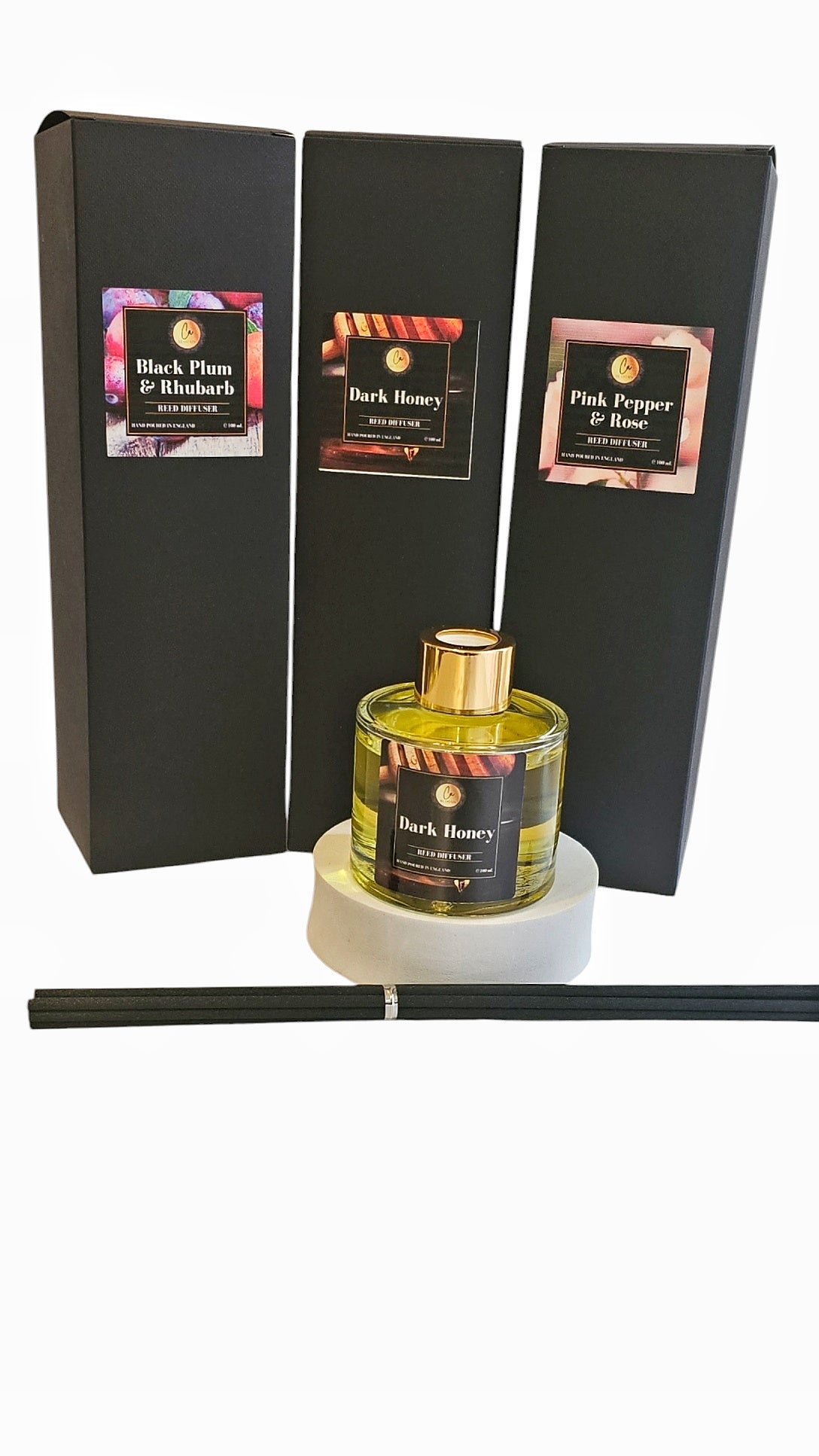 Each diffuser is hand-poured with care and beautifully presented in your choice of gloss black, matte gold, or clear glass bottle, each diffuser is paired with premium reeds for a consistent and long-lasting scent release.